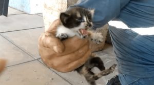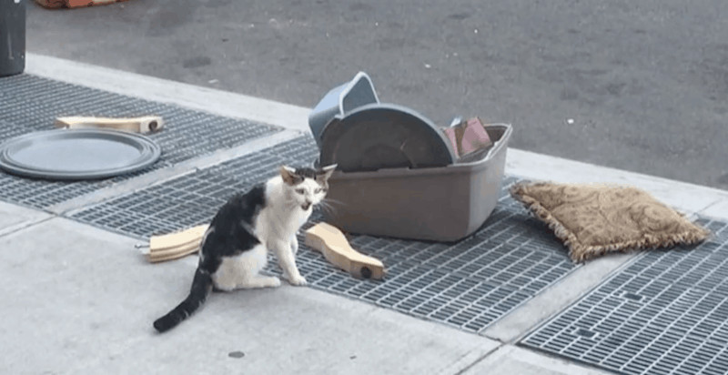 A street sweeper who was on the job in Brooklyn stumbled upon an unusual sight. A lovely kitten was thrown in the middle of the street with a box containing its belongings such as some broken toys and a pillow. The man saw the sadness into the cat’s eyes and rushed to take it in his hands, but it was way too scared and didn’t trust humans, so it quickly ran away.