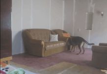 Two doggie pals are making dog lovers smile with their adorable game of hide and seek. The two dogs are seen ducking in, out and around two couches in a room. The puppy peeks around the couch several times trying to see where his friend is so he can either chase after him or continue to hide.