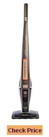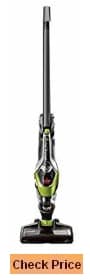 It offers an extra large capacity bin for a cordless vacuum. The charging base doubles as a tool holder. It runs twenty to thirty minutes on a fully charged battery, so this stick vacuum is best used for spot cleaning or cleaning a small apartment.