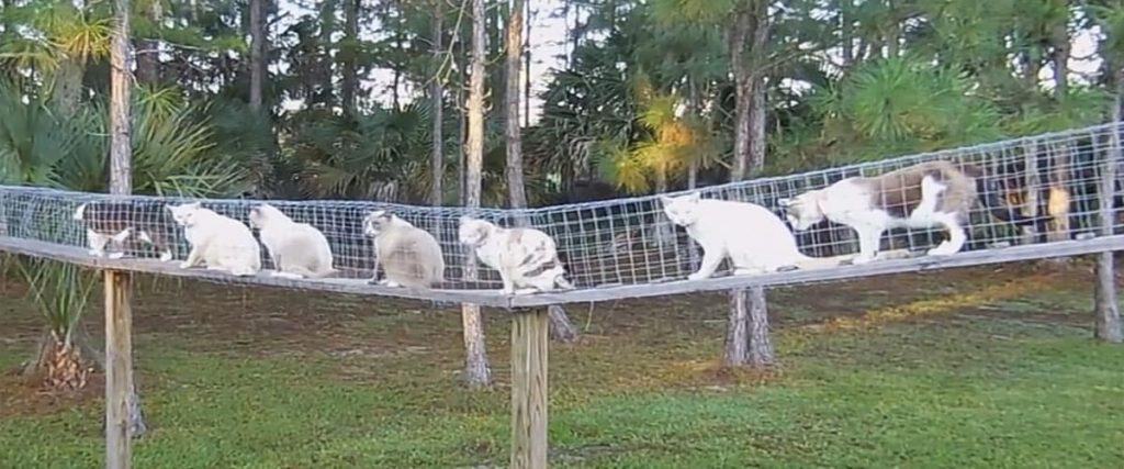 That is why the family in the following video made an ingenious outdoor space for their cats. A bridge was built from the house to an enclosed pen outside. The cats could access the area from the bridge, and they were pretty quick to try it out! Look at them walking in line!