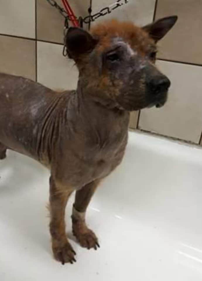 One woman named Karla Solis spotted a terrified animal trembling beneath a car in Tijuana, Mexico one day. It was balding, frightened and starving, and she knew she had to help it. After several attempts, Karla managed to coax the frightened creature out to where she stood. However, the dog was in terrible shape, and was too afraid to make any eye contact with her.