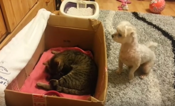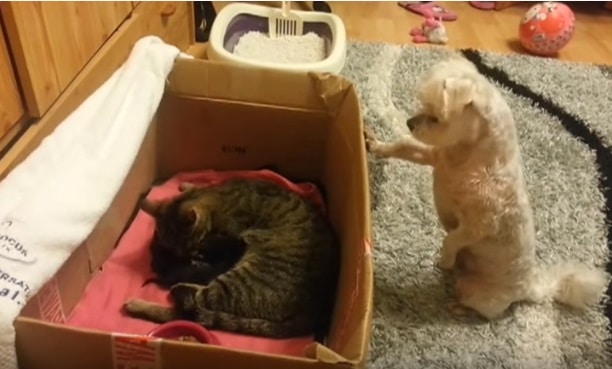 It’s no secret that kittens are adorable. The same goes for puppies and pretty much baby animals of any kind. This video is about a dog getting a glimpse of a kitten for the very first time. Inside the box is Mom with her newborn and outside is a curious pooch. When he realizes what’s going on, he wants a look.