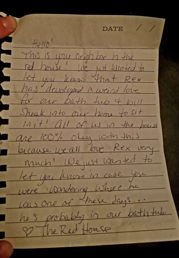 The note from Crane’s neighbor read, “Hello! This is your neighbor in the red house! We just wanted to let you know that Rex has developed a weird love for our bathtub + will sneak into our home to sit in it!”