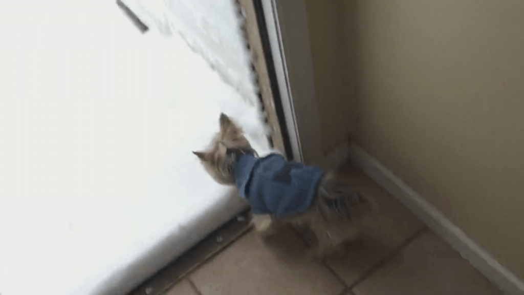 So here we’ve this cool owner with a nice dog named Lulu. When a snow storm hit the neighborhood, the owner dressed up Lulu in a nice blue sweater to keep her warm, and then she let her out into the open in the morning. Now you need to see what happens when Lulu steps out of the door and meets the snow. She doesn’t like it any bit.